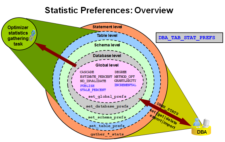 注意:可以使用dba_tab_stat_prefs视图查看所有相关表的所有有效统计数据首选项设置。