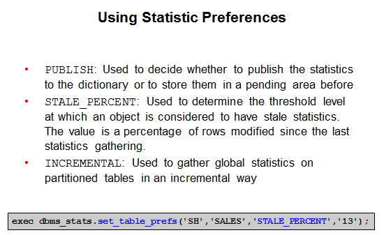 SQL> exec dbms_stats.set_table_prefs('HR','EMP','STALE_PERCENT','13');