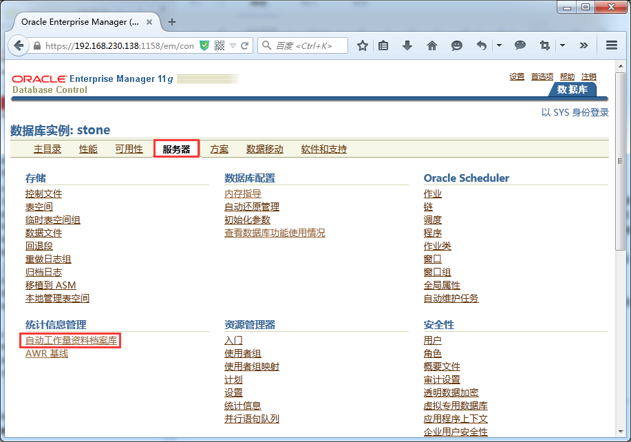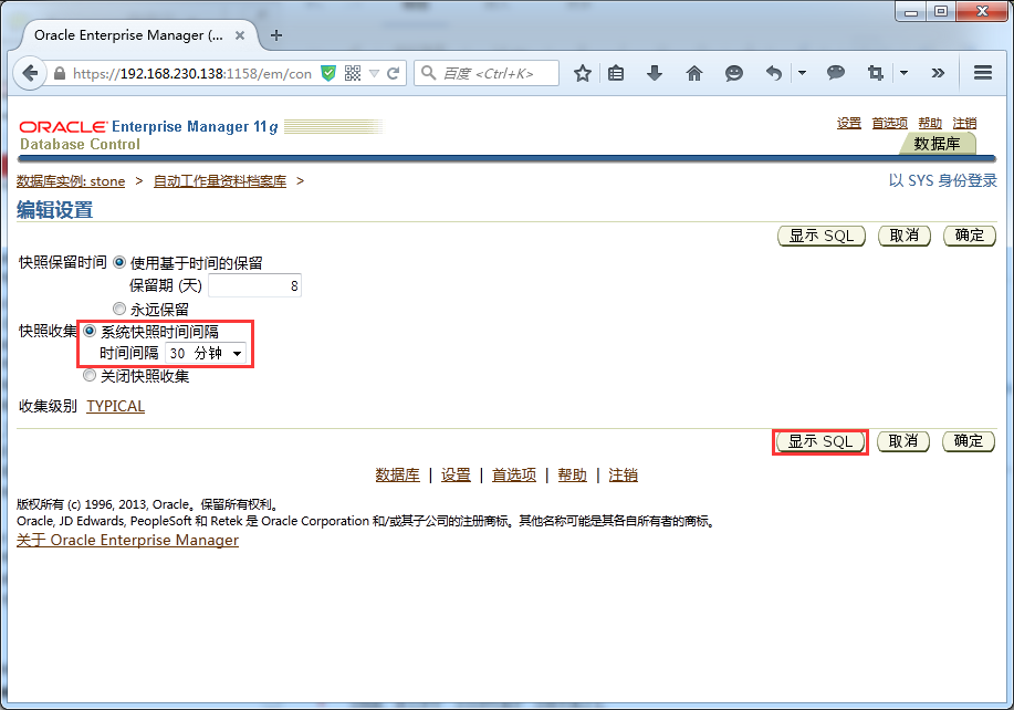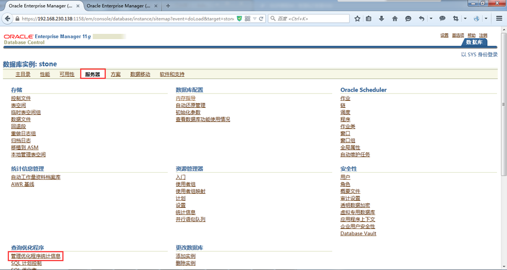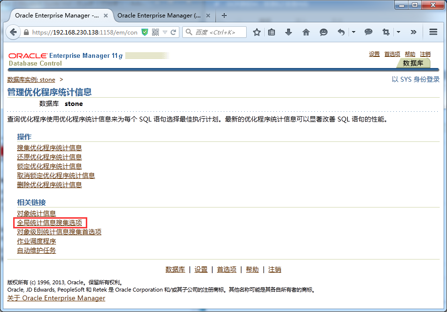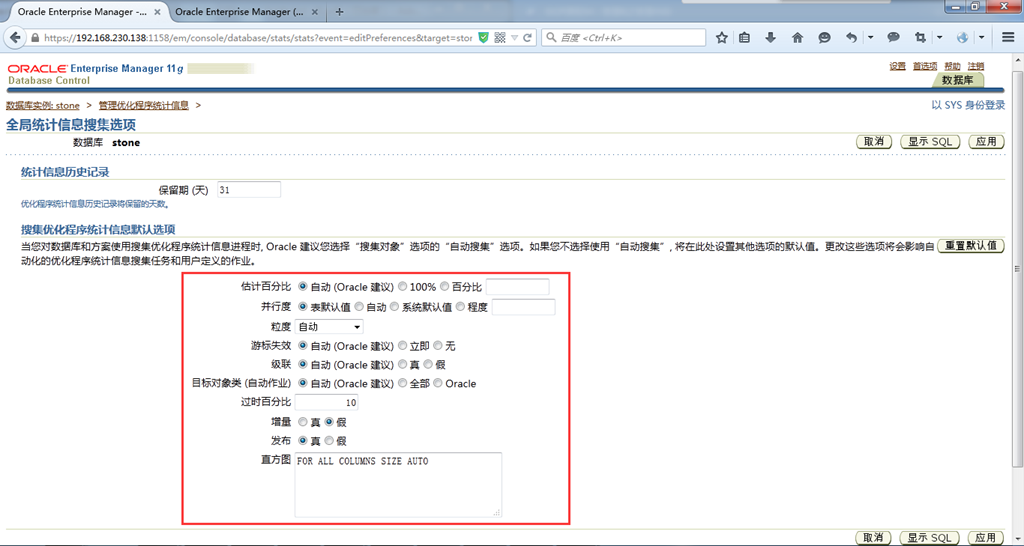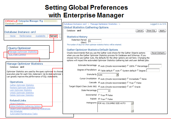 可以使用EM控制全局首选项设置。在主页选项服务器选项卡,点击管理优化程序统计信息,然后选择全局统计信息收集选项链接。