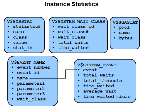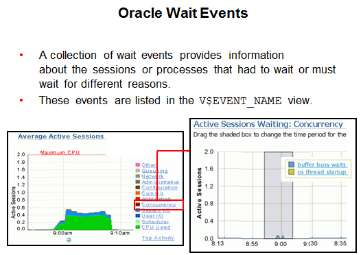 数据库中有800多个等待事件,包括空闲缓冲区等待(free buffer wait),闩锁空闲(latch free),缓冲区忙等待(buffer busy waits),数据库文件顺序读(db file sequential read)和数据库文件分散读(db file scattered read)。