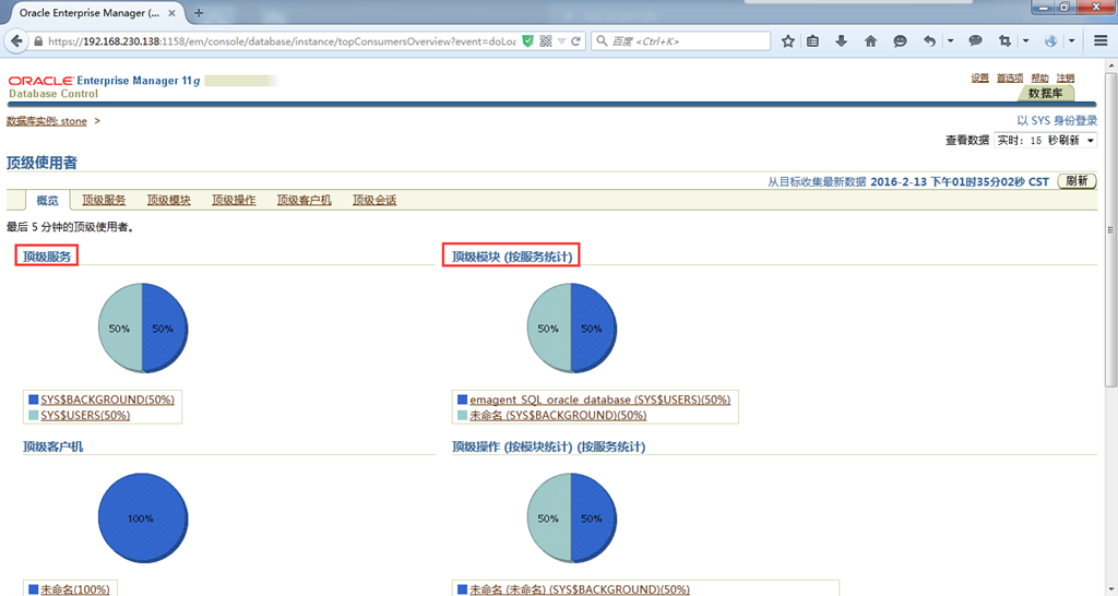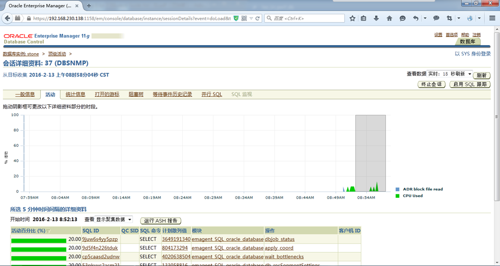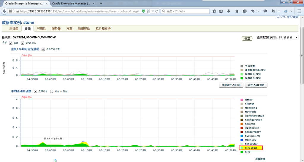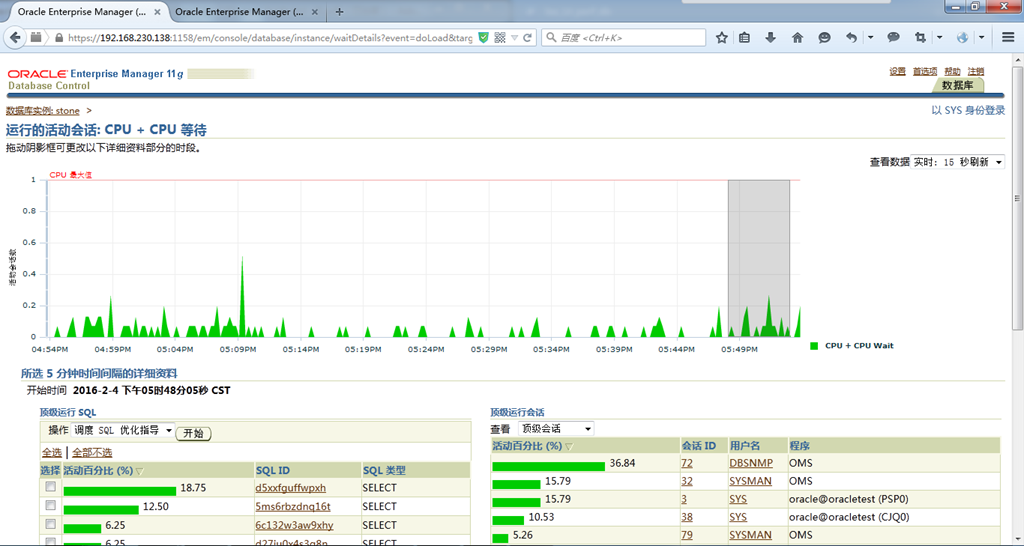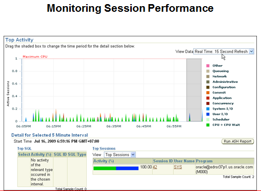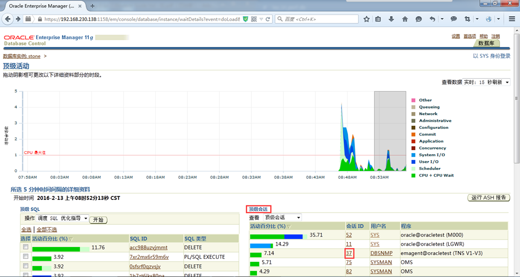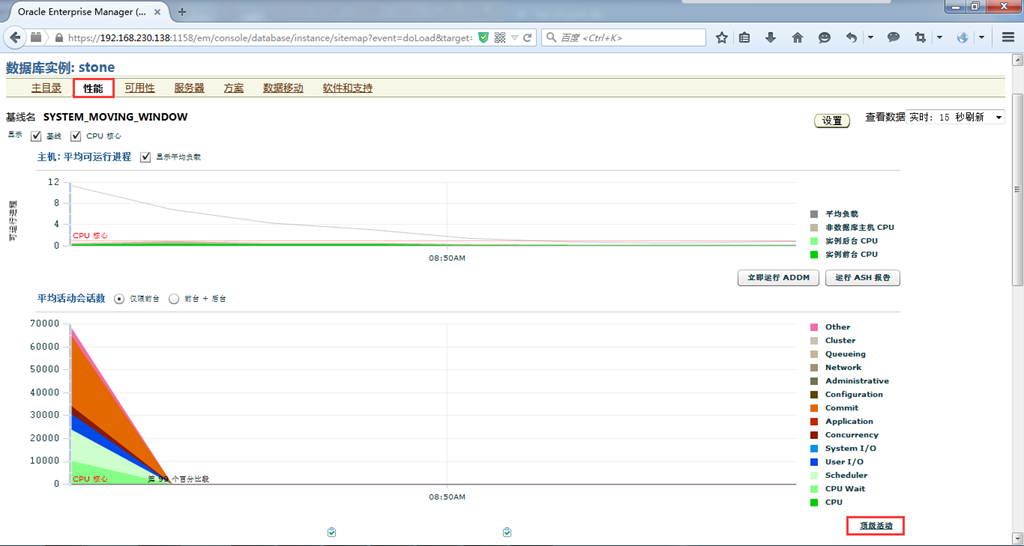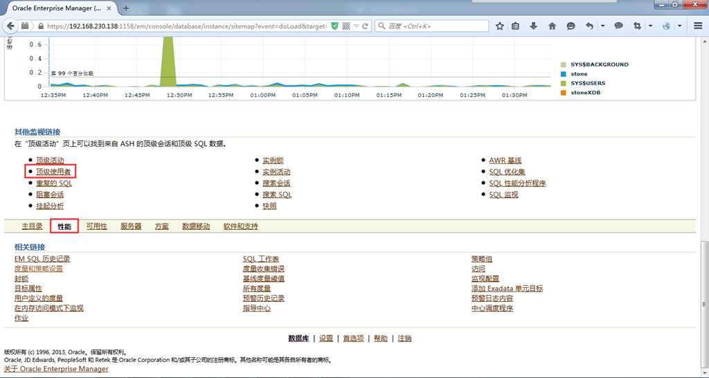 EM的性能页面从几个角度显示性能指标图。可以看到CPU,平均活动会议,吞吐量,I/O及其他性能指标。从性能页面,可以获取详细信息链接:包括会话和单个SQL语句。