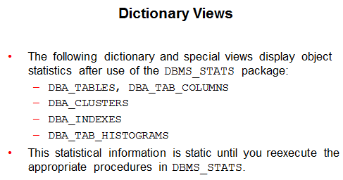 此功能允许覆盖GATHER_*_STATS存储过程及在对象或者模式级别进行自动优化程序统计数据收集的默认行为。可以使用dbms_stats包管理收集统计数据选项。