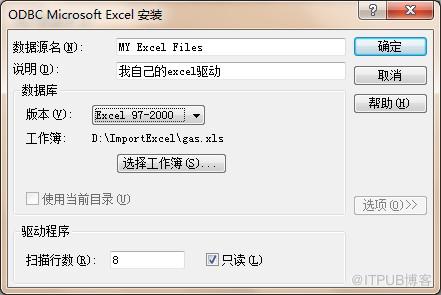3.点击完成,在弹出的对话框中的数据源名称后面写上:Excel Files,说明里写上:mysql excel driver
