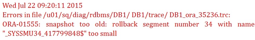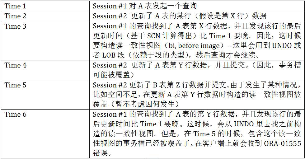 但 是在查找的过程中,可能会发现当前undo块里记录的ITL槽的SCN号比上一个undo块里记录的SCN号还要大。这种情况说明由于事务被提交或回滚, 导致当前找到的undo块里的数据已经被其他事务覆盖了,于是我们无法再找出小于等于发出查询时的那个时间点的SCN号,这时Oracle就会抛出一个非 常经典的错误——ORA-1555,也就是snapshot too old的错误。