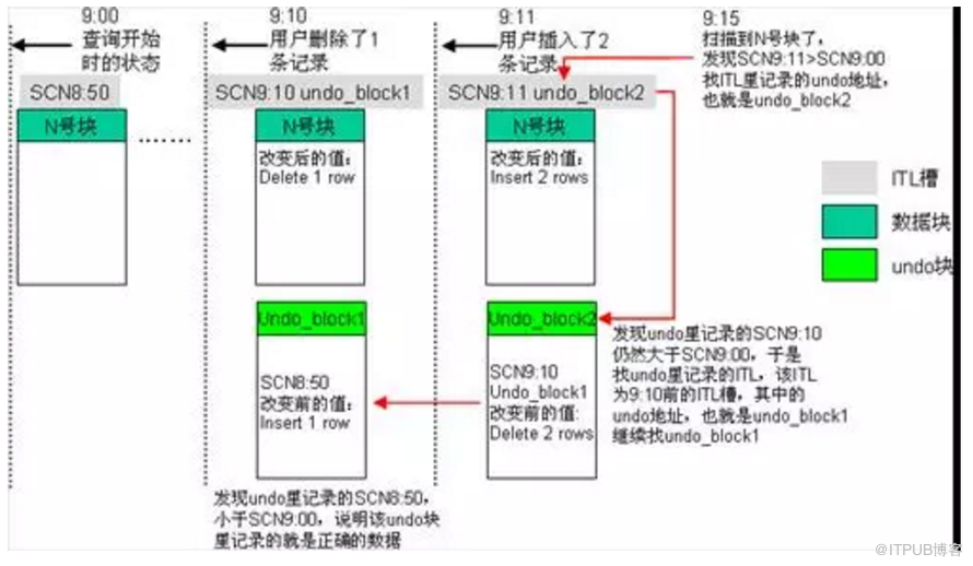 发现该undo块里记录的ITL信息为[Undo_block0 / SCN8.50], 这时ITL里的SCN8.50小于发出查询时的SCN9.00,说明这时undo块包含合适的undo信息,于是服务器进程不再找下去,而是将N号块、 Undo_block2以及Undo_block1的数据结合起来,构建CR块。将当前N号的数据复制到CR块里,然后在CR块里先回退9点11分的事 务,也就是在CR块里删除两条记录,然后再回退9点10分的事务,也就是在CR块里插入被删除的记录,从而构建出9点钟时的数据。