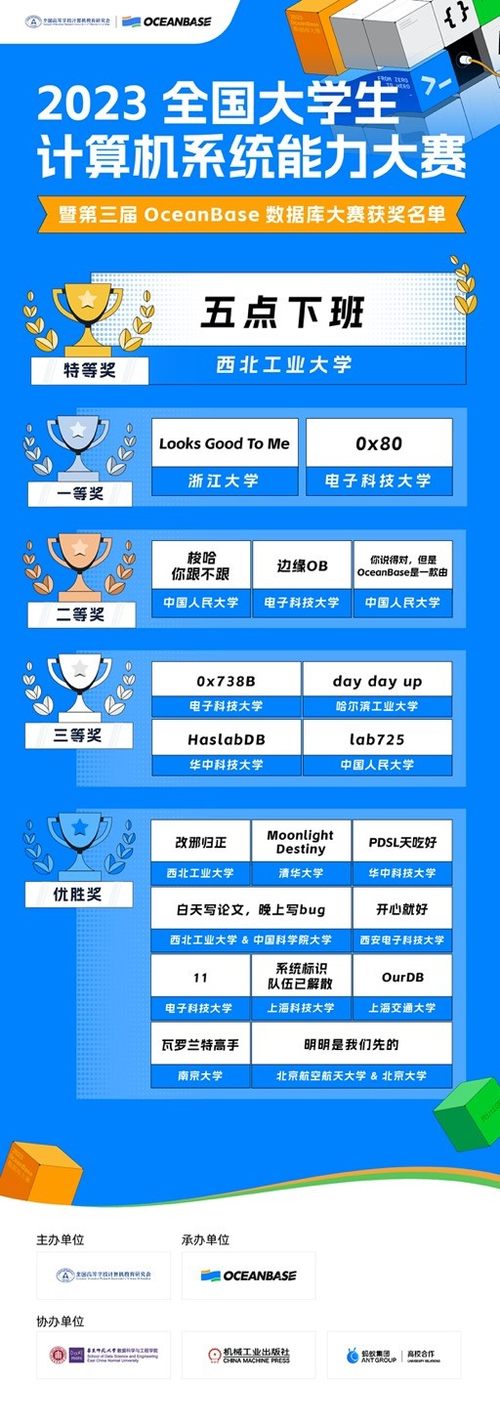 近日,2023全国大学生计算机系统能力大赛暨第三届OceanBase数据库大赛落下帷幕。本届大赛共吸引海内外包括新加坡国立大学、清华大学、浙江大学、西安交通大学等268所高校的1154支队伍参赛,经过三个多月的比拼,来自西北工业大学的“五点下班”队夺得冠奖,获10万奖金。