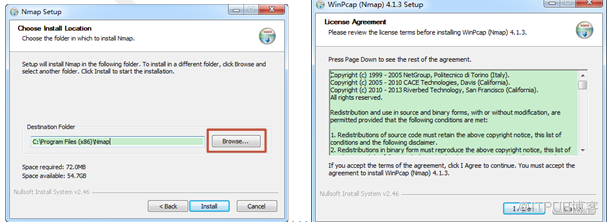 (4)该界面是用来设置Nmap安装位置的。如果用户希望安装到其它位置的话,则单击Browse按钮,选择要安装的位置。这里使用默认的位置,然后单击Install按钮,将弹出WinPcap许可协议对话框,如图1.6所示。