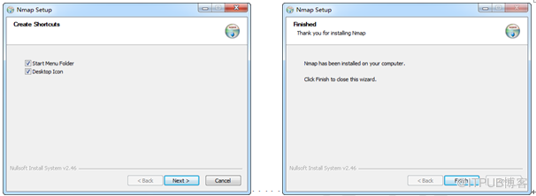 (10)该界面用来设置Nmap工具创建快捷方式的位置。默认是在启动菜单栏和桌面上创建快捷方式,这里使用默认设置。然后,单击Next按钮,将弹出Nmap完成对话框,如图1.12所示。
