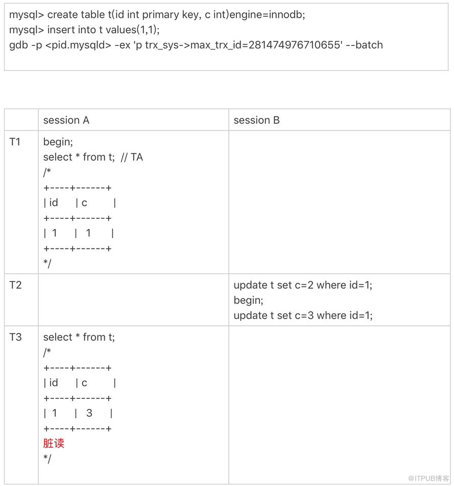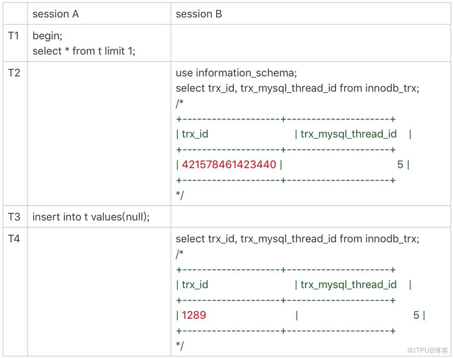 直到 session A 在 T3 时刻执行 insert 语句的时候,InnoDB 才真正分配了 trx_id。所以,T4 时刻,session B 查到的这个 trx_id 的值就是 1289。