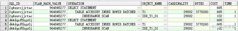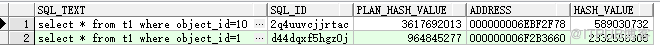 从上图可以看出,两条 SQL 的 PLAN_HASH_VALUE 是一样的,走了相同的执行计划。