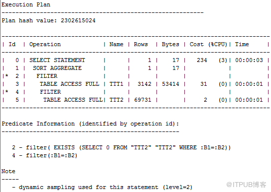 exists 表示子查询语句返回结果不为空 , where 条件成立 , 就会执行主sql 语句 , 显然 "TTT1"."TABLE_NAME" = "TTT1"."TABLE_NAME" 条件无异于where 1=1 ,最终导致对tt1 表进行全表统计,即 select count(*) from ttt1;