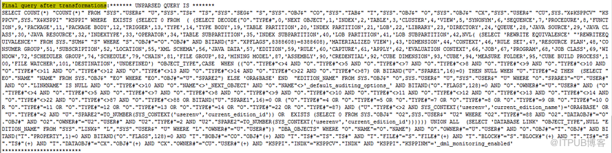 SELECT COUNT(*) "COUNT(*)" FROM "SYS"."USER$" "U", "SYS"."TS$" "TS", "SYS"."SEG$" "S", "SYS"."OBJ$" "CO", "SYS"."TAB$" "T", "SYS"."OBJ$" "O", "SYS"."OBJ$" "CX", "SYS"."USER$" "CU", SYS."X$KSPPCV" "KSPPCV", SYS."X$KSPPI" "KSPPI" WHERE EXISTS ......;