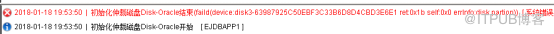 [Info ]2018-01-18 19:53:57 | 删除资源组(Oracle)成功。 [ EJDBAPP1 ] [Info ]2018-01-18 19:53:57 | [Client]停止资源组(Oracle)中的资源($AllResource)完成。 [ EJDBAPP1 ] [Info ]2018-01-18 19:53:56 | 删除资源组(Oracle)成功。 [ EJDBAPP2 ] [Info ]2018-01-18 19:53:56 | [HBT-Client]停止资源组(Oracle)中的资源($AllResource)完成。 [ EJDBAPP2 ] [Warn ]2018-01-18 19:53:50 | 创建磁盘组失败 [ 磁盘没有初始化 : 27 ] [ EJDBAPP1, GUI ] [Error]2018-01-18 19:53:50 | 初始化仲裁磁盘Disk-Oracle结束(faild(device:disk3-63987925C50EBF3C33B6D8D4CBD3E6E1 ret:0x1b self:0x0 errInfo:disk.partion)) [ 系统错误:27 ] [ EJDBAPP1 ] [Info ]2018-01-18 19:53:50 | 初始化仲裁磁盘Disk-Oracle开始 [ EJDBAPP1 ] [Info ]2018-01-18 19:53:16 | 创建资源组(Oracle)成功。 [ EJDBAPP2 ] [Info ]2018-01-18 19:53:16 | 创建资源组成功 [ EJDBAPP1 EJDBAPP2 , GUI ] [Info ]2018-01-18 19:53:16 | 创建资源组(Oracle)成功。 [ EJDBAPP1 ] [Info ]2018-01-18 19:18:04 | 本地节点初始化完成。 [ EJDBAPP2 ] [Info ]2018-01-18 19:18:03 | 本地节点初始化开始。 [ EJDBAPP2 ] [Info ]2018-01-18 19:18:01 | 本地节点初始化完成。 [ EJDBAPP1 ] [Info ]2018-01-18 19:18:00 | 本地节点初始化开始。 [ EJDBAPP1 ] [Info ]2018-01-18 19:17:59 | 到(EJDBAPP1)的心跳(HBT_192.168.50.0)正常。 [ EJDBAPP2 ] [Info ]2018-01-18 19:17:59 | 到(EJDBAPP1)的心跳(HBT_192.168.60.0)正常。 [ EJDBAPP2 ] [Info ]2018-01-18 19:17:59 | 到(EJDBAPP2)的心跳(HBT_192.168.50.0)正常。 [ EJDBAPP1 ] [Info ]2018-01-18 19:17:59 | 到(EJDBAPP2)的心跳(HBT_192.168.60.0)正常。 [ EJDBAPP1 ] [Info ]2018-01-18 19:17:58 | 服务器"EJDBAPP2"加入群集成功 [ EJDBAPP2, GUI ] [Info ]2018-01-18 19:17:58 | 心跳(HBT_192.168.60.0)绑定端口(3001)成功。 [ EJDBAPP2 ] [Info ]2018-01-18 19:17:58 | 心跳(HBT_192.168.50.0)绑定端口(3000)成功。 [ EJDBAPP2 ] [Info ]2018-01-18 19:17:58 | 创建群集(Oracle10G[EJDBAPP1,EJDBAPP2])成功。 [ EJDBAPP2 ] [Info ]2018-01-18 19:17:58 | 服务器"EJDBAPP1"加入群集成功 [ EJDBAPP1, GUI ] [Info ]2018-01-18 19:17:58 | 心跳(HBT_192.168.50.0)绑定端口(3000)成功。 [ EJDBAPP1 ] [Info ]2018-01-18 19:17:58 | 心跳(HBT_192.168.60.0)绑定端口(3001)成功。 [ EJDBAPP1 ] [Info ]2018-01-18 19:17:58 | 创建群集(Oracle10G[EJDBAPP1,EJDBAPP2])成功。 [ EJDBAPP1 ] [Info ]2018-01-18 19:15:04 | 登录服务器成功 [ EJDBAPP2, GUI ] [Info ]2018-01-18 19:15:01 | 登录服务器成功 [ EJDBAPP1, GUI ]
