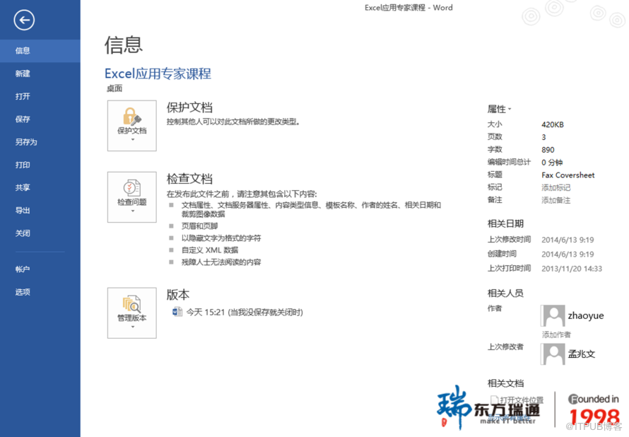打开文档后,单击【文件】按钮即可打开全新的后台视图,其自动显示的是“信息”视图中的内容。