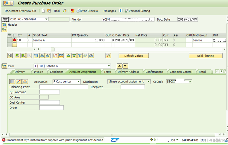 「SAP技术」 SAP MM 不能向被分配了工厂代码的供应商采购服务?