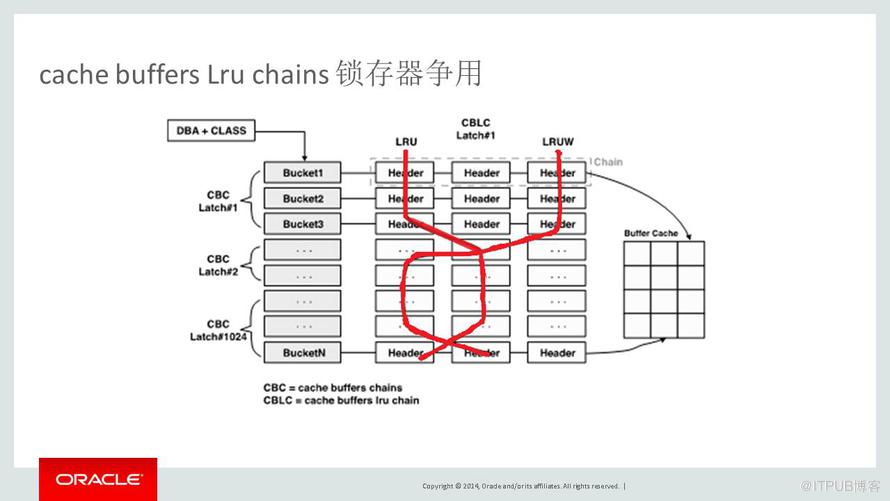 Buffer header有指向实际缓冲区的指针。注意:Hash Chain结构是在共享池中,而实际缓冲区信息存储在高速缓冲区中。 Hash Chain结构利用cache buffers chain Latch来保护。 当进程扫描特定的数据块时,必须获得相应数据块所在Hash Chain管理的cache buffers chain Latch。基本上 一个进程获得仅有的一个cache buffers chain Latch,一个cache buffers chain Latch管理多个Hash Chain。
