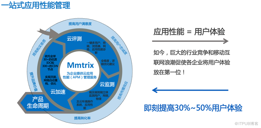 互联网时代下,个体的力量已经足以撼动整个社会。互联网赋予每一个人无限的可能,让个人力量增强、个人价值释放。如今,巨大的行业竞争与移动互联网浪潮促使各企业将用户体验放在第一位。而性能魔方(Mmtrix)为企业提供云应用性能(APM)管理服务,完美创始云加速、云评测、云监测一站式应用性能管理服务,提升品牌价值,提高购买意愿、用户满意度、用户忠诚度、传播效应、转化率,提升产品生命周期,提高30%——50%用户体验度。由此,我们可以称之为我们是产品性能和用户体验“石器时代”的终结者,更是下一个完美解决用户体验的开创者,在你我的精诚合作之下,在竞争中,开创互联网时代的下一片蓝海。