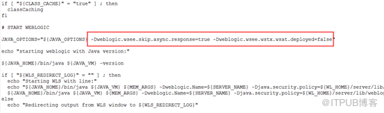 修改 Server 的启动脚本,比如 startWebLogic.sh 或 setDomainEnv.sh ,在 Java 启动选项中增加“ -Dweblogic.wsee.skip.async.response=true -Dweblogic.wsee.wstx.wsat.deployed=false ”,例如: