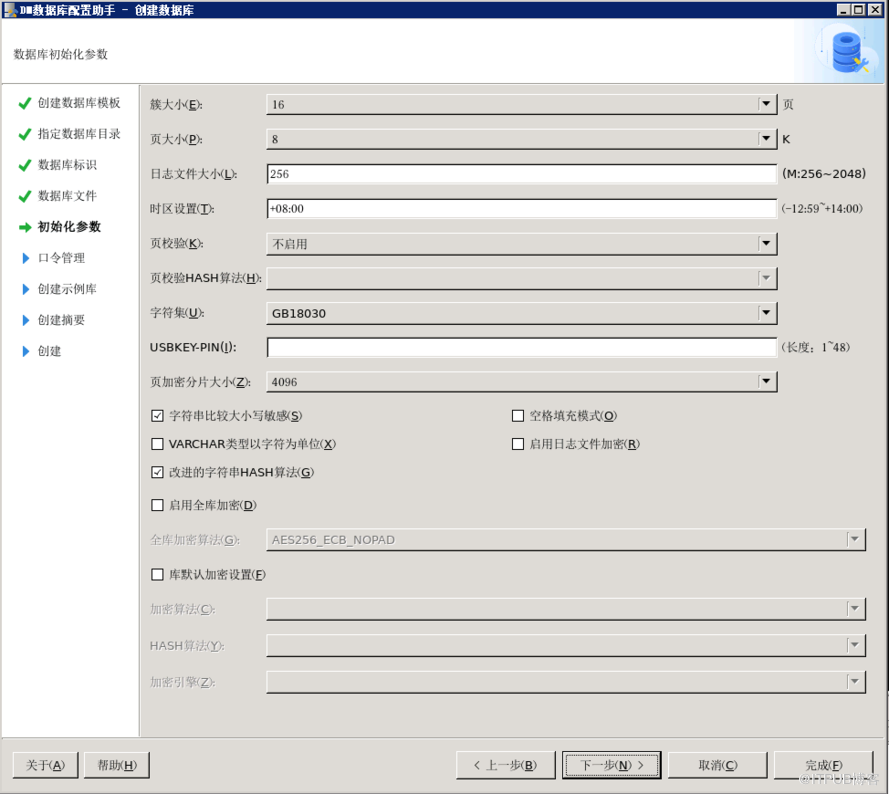 8.配置初始化参数,例如簇(对标Oracle的区extend,连续的块),页大小(对标Oracle的块默认8K),日志文件大小默认256MB,时区设置、字符串大小写敏感等,设置后继续点击【下一步】