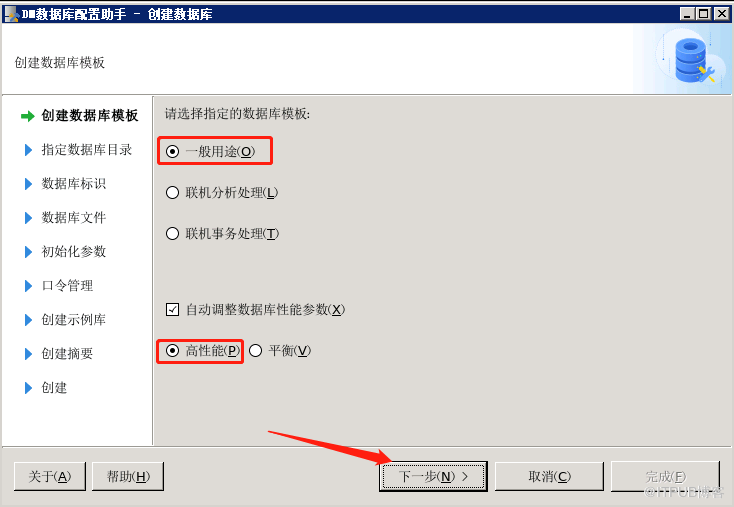 4.选择【一般用途】,默认勾选自动调整数据库性能参数【高性能】,点击【下一步】
