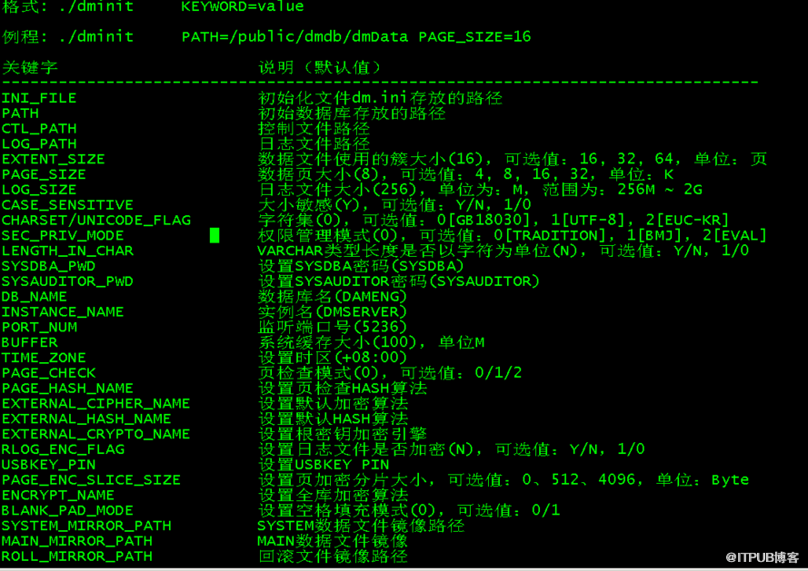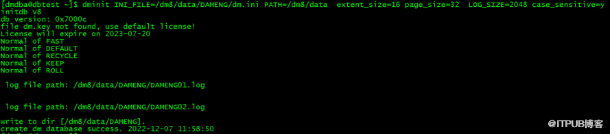 dminit INI_FILE=/dm8/data/DAMENG/dm.ini PATH=/dm8/data extent_size=16 page_size=32 LOG_SIZE=2048 case_sensitive=y