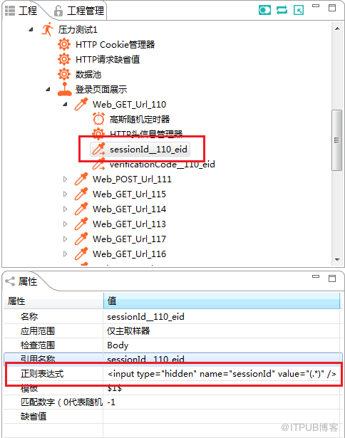 该请求的sessionId在回放的时候发生了变动,若要脚本正常运行,此处便要对其做关联操作。提取过程便需要添加正则表达式提取器,见下图: