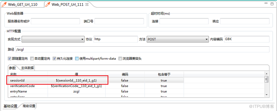 此处正则表达式需要提取sessionId的数值,故在数据产生行,将实际数值替换成(.*),将变量命名为sessionId__110_eid,多一句嘴:名字虽然可以任意起,但是最好起一个有意义的名字,方便脚本的查看调试。