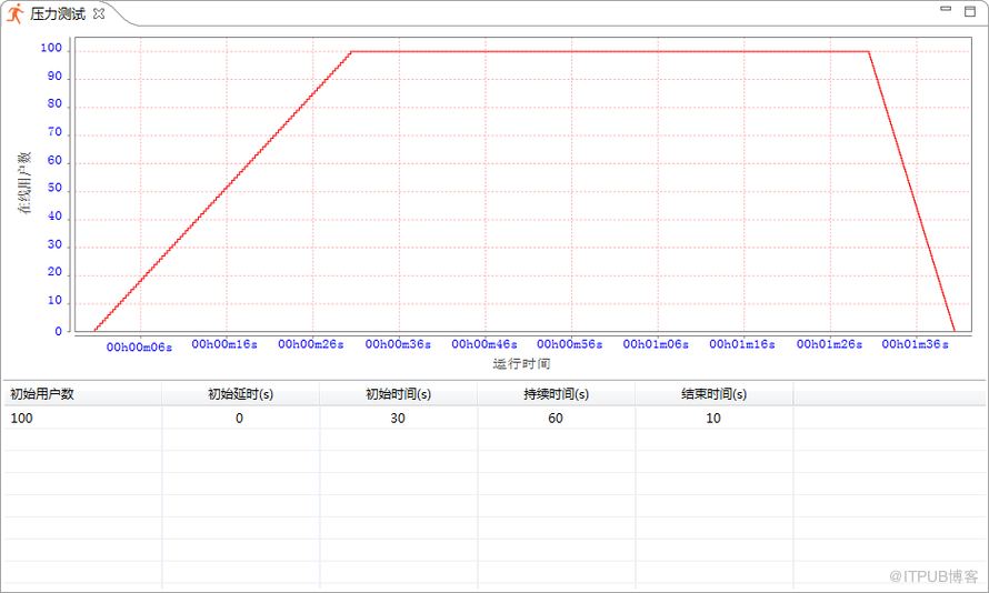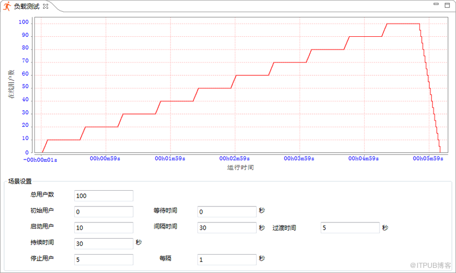 所谓负载测试,从图上直观上看就是一批一批的加用户,待到当前在线用户执行稳定后,再加下一批的用户,像这样不停的持续加压,直至系统性能明显下降或系统崩溃为止。是测试系统用户上限,查找系统性能瓶颈的重要手段。通常在还不知道系统能承载多大业务量的情况下,为找到用户承载量极限或为了快速定位系统性能瓶颈时,会采用此种方式进行测试。