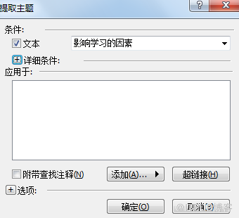 随后,在打开的提取主题对话框内,输入想要进行提取的主题的条件,比如文本就在后面的文本对话框内进行输入关键字词,如果不需要则将文本够选去掉。