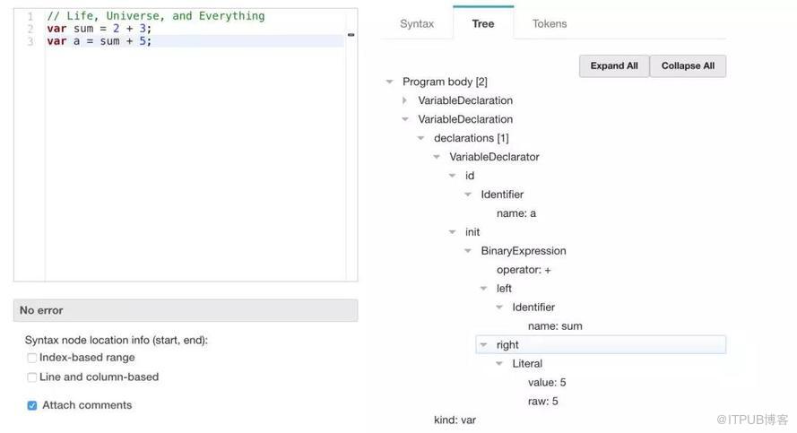Parser会把Lexer分析之后生成的token序列进行语法分析,并生成对应的一棵抽象语法树(AST)。这个树长什么样呢?在这里推荐一个网站: esprima Parser ,输入JS语句可以立马生成我们所需的AST。例如,以上语句就被生成这样的一棵树: