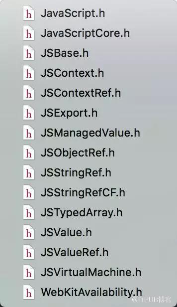 iOS官方文档 对JSCore的介绍很简单,其实主要就是给App提供了调用JS脚本的能力。我们首先通过JSCore Framework的15个开放头文件来“管中窥豹”,如下图所示: