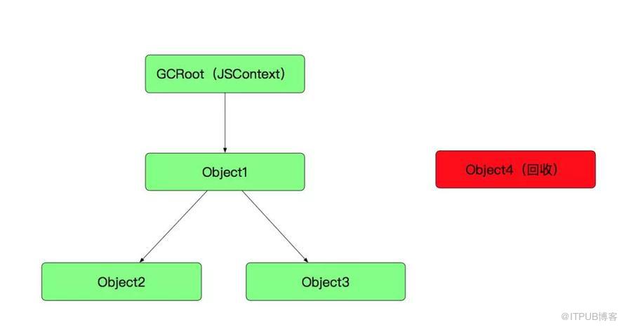 JS同样也不需要我们去手动管理内存。JS的内存管理使用的是GC机制(Tracing Garbage Collection)。不同于OC的引用计数,Tracing Garbage Collection是由GCRoot(Context)开始维护的一条引用链,一旦引用链无法触达某对象节点,这个对象就会被回收掉。如下图所示: