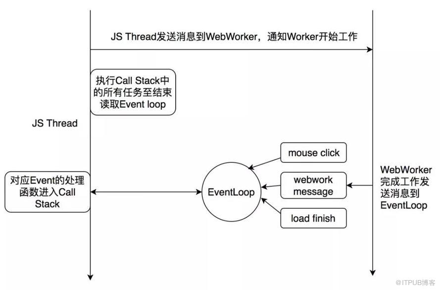 JS线程和工作线程,以及浏览器事件之间的通信机制叫做事件循环(EventLoop),类似于iOS的runloop。它有两个概念,一个是Call Stack,一个是Task Queue。当工作线程完成异步任务之后,会把消息推到Task Queue,消息就是注册时的回调函数。当Call Stack为空的时候,主线程会从Task Queue里取一条消息放入Call Stack来执行,JS主线程会一直重复这个动作直到消息队列为空。