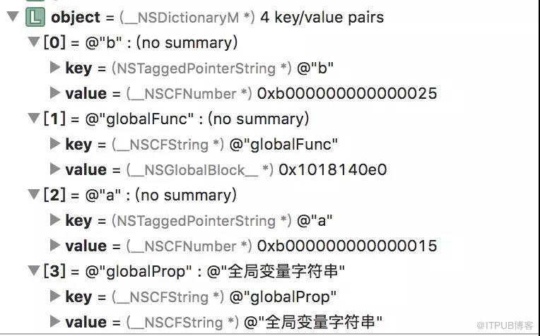 可以看到这个globalObject保存了所有的变量与函数,这更加印证了上文的说法(至于为什么globalObject对应OC对象是NSDictionary类型,我们将在下节中讲述)。所以我们还能得出另外一个结论,JS中所谓的全局变量,全局函数不过是全局对象的属性和函数。