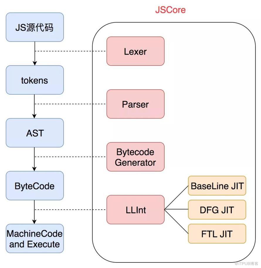 从功能上来看,一个高级语言虚拟机主要分为两部分,一个是解释器部分,用来运行高级语言编译生成的ByteCode,还有一部分则是Runtime运行时,用来负责运行时的内存空间开辟、管理等等。实际上,JSCore常常被认为是一个JS语言的优化虚拟机,它做着JVM类似的事情,只是相比静态编译的Java,它还多承担了把JS源代码编译成字节码的工作。