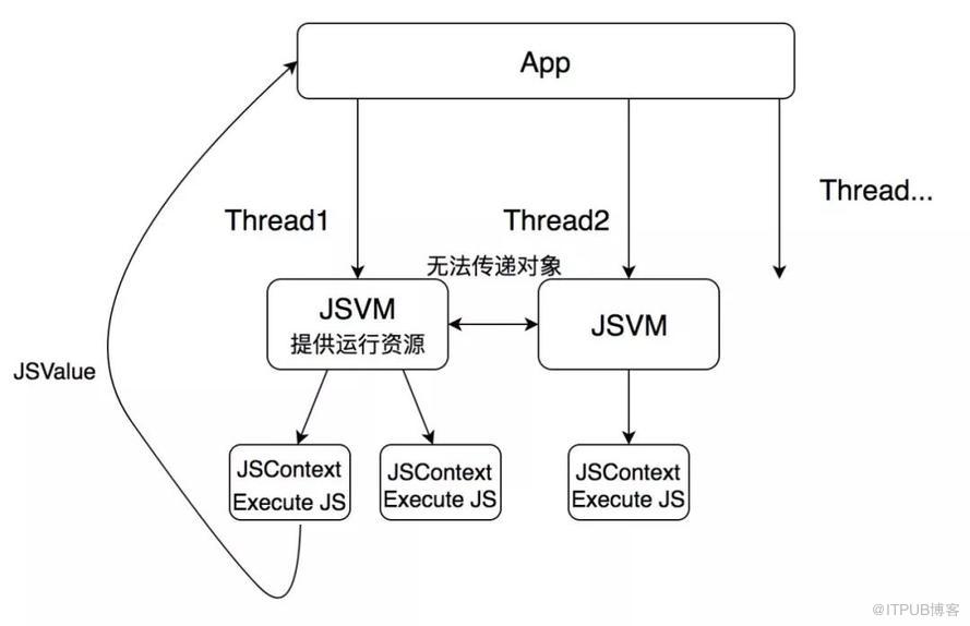 一个JSVirtualMachine(以下简称JSVM)实例代表了一个自包含的JS运行环境,或者是一系列JS运行所需的资源。该类有两个主要的使用用途:一是支持并发的JS调用,二是管理JS和Native之间桥对象的内存。