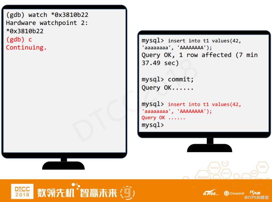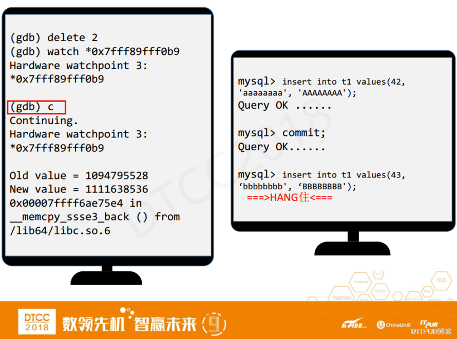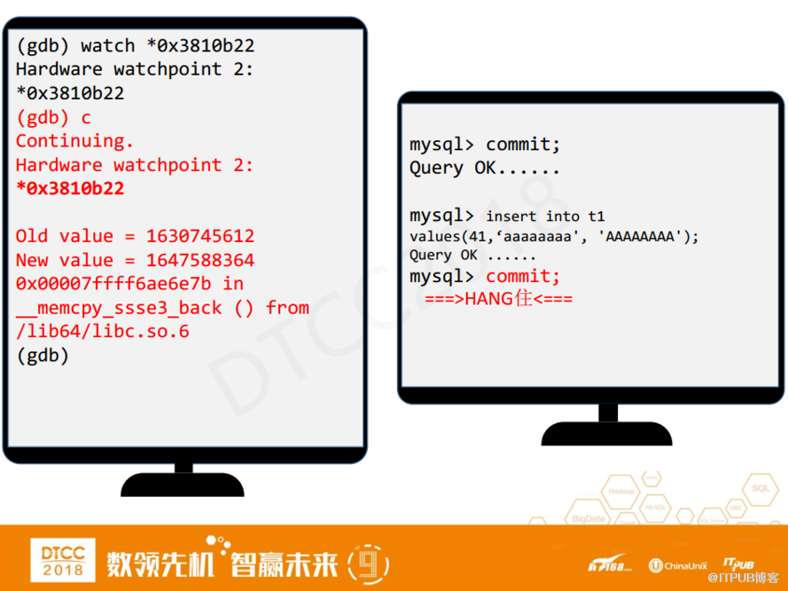 然后再去执行commit,又一次被 Hang住了,探针也被触发了,我们在这里看到了两个值Old Value和New Value。