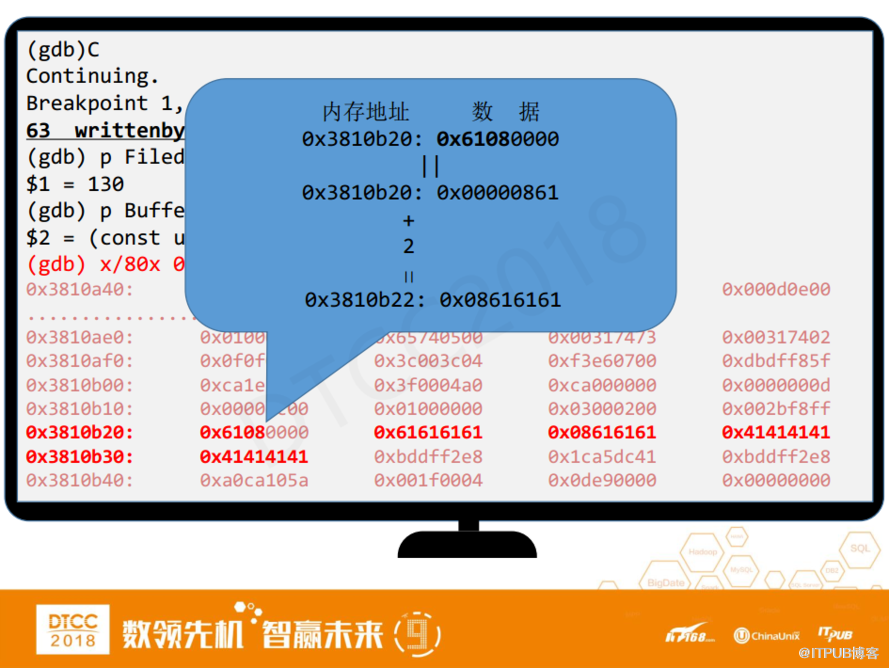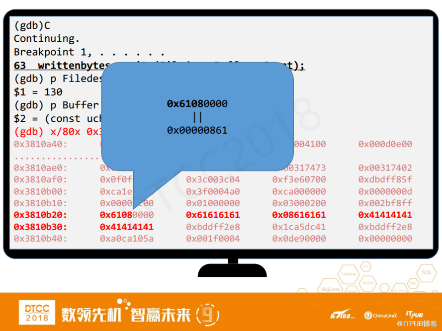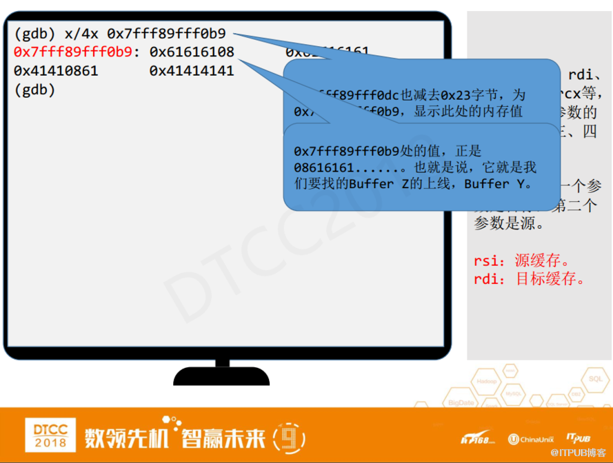 下面我们来验证一下。用X命令来显示内存,其中后四位f0b9就是刚才rsi减去0x23的值,其内存值 0x61616108,也就是刚才Insert语句中的第二列,那么f0b9就是buffer y的准确地址了。