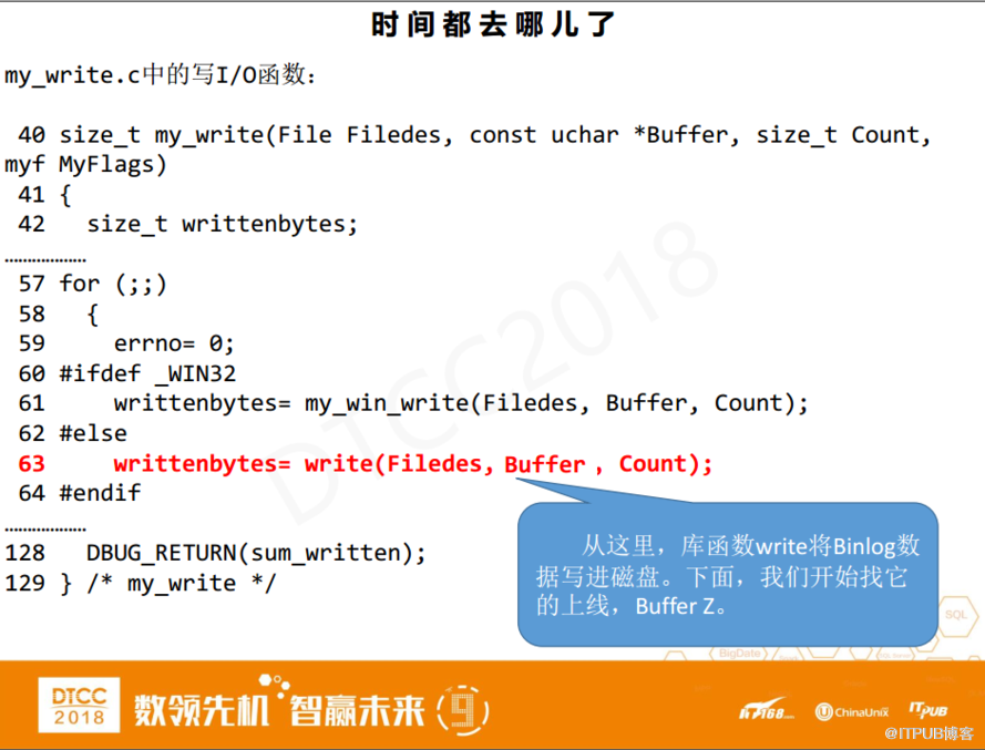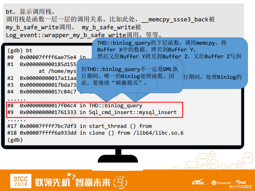 以binlog为例,binlog数据最终是要写进磁盘的。写磁盘的时候一定是从某一个buffer写到磁盘里,我们就称这个buffer为buffer z,那么这个buffer数据是从哪儿来的?假设buffer z的数据是从buffer y拷贝过去的,那我们就称buffer y是buffer z的上线。那么buffer y的上线是谁?上上线又是谁?……如此顺藤摸瓜,我们就可以找到binlog的处理函数了。