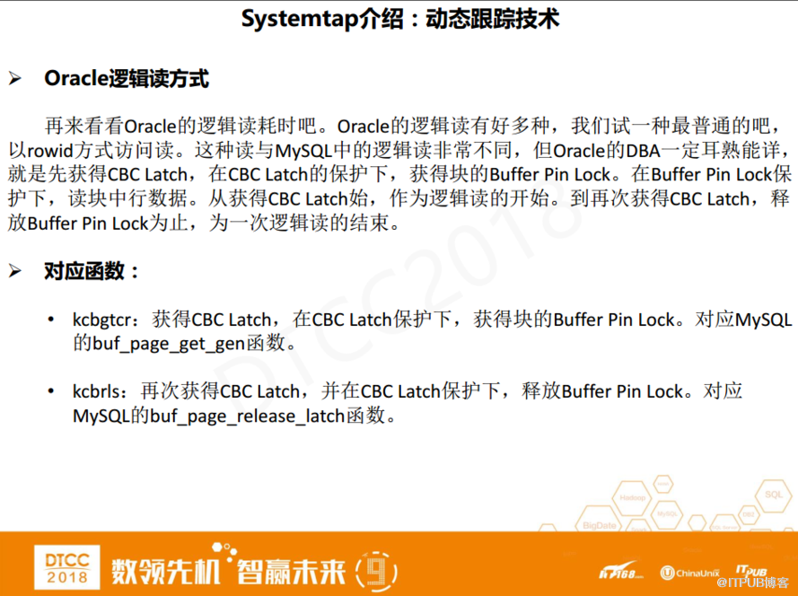 其中,kcbgtcr函数对应MySQL里的buf_page_get_gen函数,也就是获得函数。kcbrls对应MySQL的buf_page_release_latch函数。