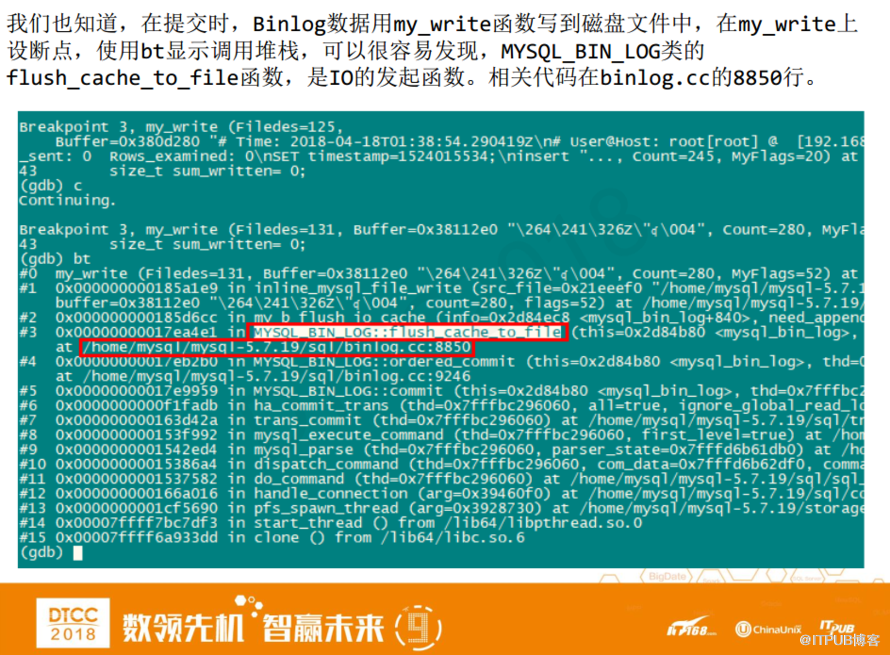 我们也知道提交时binlog数据是用my_write函数写到磁盘中,所以在my_write处设个端点,用BT显示堆栈,就可以知道在binlog写文件时哪个函数触发IO。