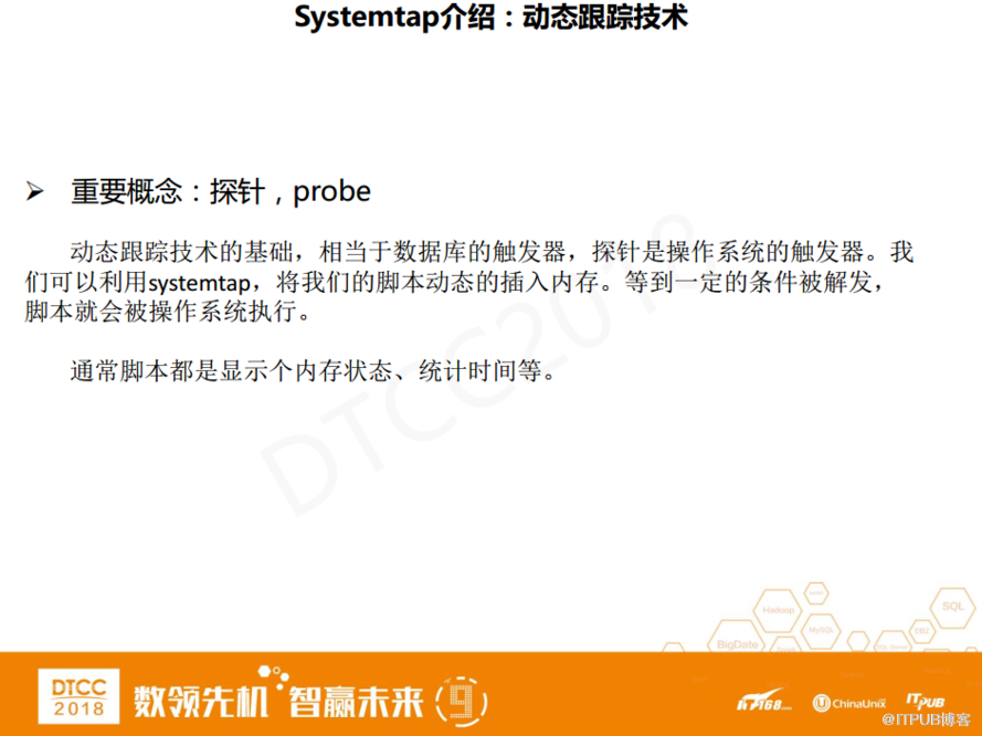 动态跟踪有一个很重要的概念叫探针,探针相当于数据库里的触发器,它是操作系统里的触发器。我们可以利用SystemTap将脚本动态插入到内存里,等到一定条件即探针,被触发执行。