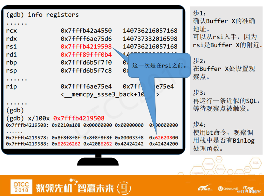 总结一下,第一步确认buffer x,这个需要从rsi、rdi参数入手,然后在buffer x处设定观察点,运行一条近似的SQL,等待观察点被触发,使用BT命令来观察调用栈中是否有binlog字样的处理函数。