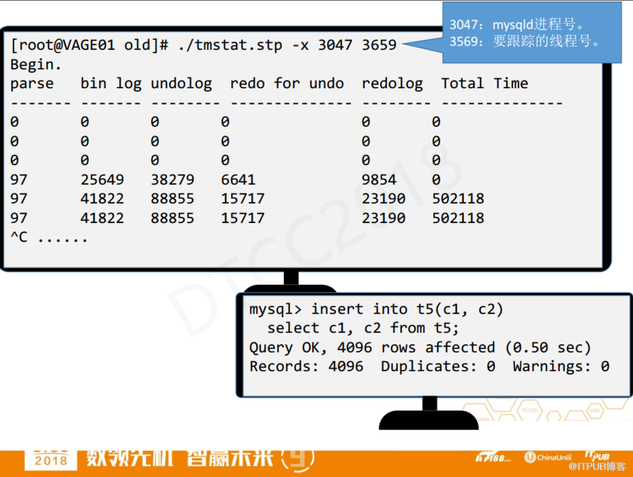 3047是mysqld的线程号,3659是要跟踪的线程号,运行脚本之后,每秒输出一行,执行插入4000多行的Insert语句,就可以能看到时间输出了。