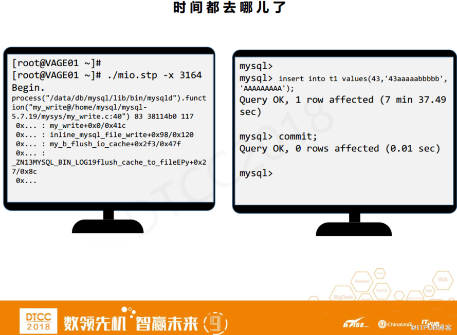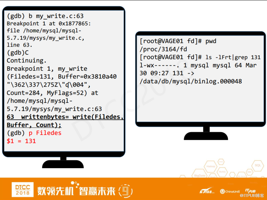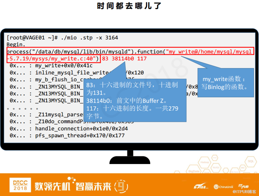 具体方法是什么呢?第一步我们要先找到写binlog到文件的函数,在MySQL里看它调用了什么函数触发了写IO。上图的这个SystemTap脚本与之前不一样的地方是,刚才脚本中函数名称是固定的,而这里使用了*write*,也就是说要跟踪所有名称中包含write字样的函数。