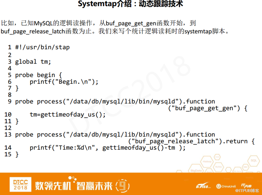 其中,第一行定义了一个脚本的解释器;第三行定义了一个全局变量,因为探针和函数类似,每个函数里的变量不能够互相传递数据,所以如果想跨探针传递数据,必须定义全局变量;第5到7行是SystemTap begin 开始探针,当脚本运行时,这个探针就会被触发。我在这里放了一个输出“begin”的提示;第九行是一个针对MySQL进程的探针,buf_page_get_gen函数入口点的探针,相当于buf_page_get_gen函数的触发器,系统执行这个函数时,探针会被先触发;第十行是记录时间,利用SystemTap的gettimeofday记录以微秒计时的时间;第十三行是buf_page_release_latch函数,当这个函数被触发调用时,用当前时间减去刚才逻辑读开始的时间就是一次完整的逻辑读耗时。