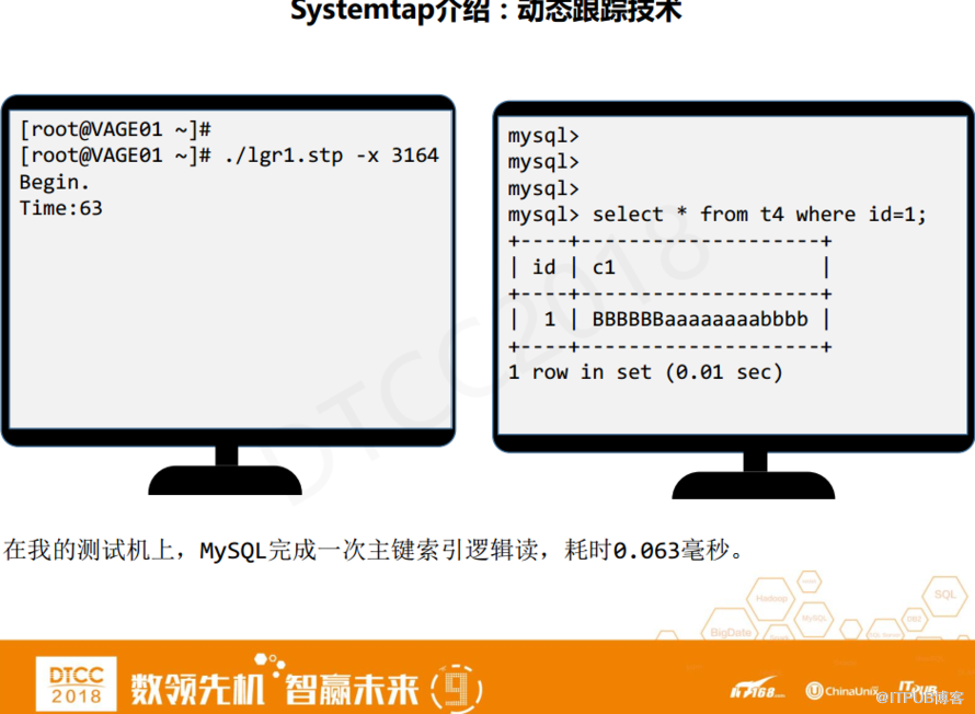 上图两个屏幕窗口,一个是MySQL客户端,一个是shell窗口。先在shell窗口去运行lgr1.stp脚本,其中3164是进程号,-x是cmd命令,运行之后会显示begin。在MySQL客户端里执行一条select语句,并执行一次逻辑读。