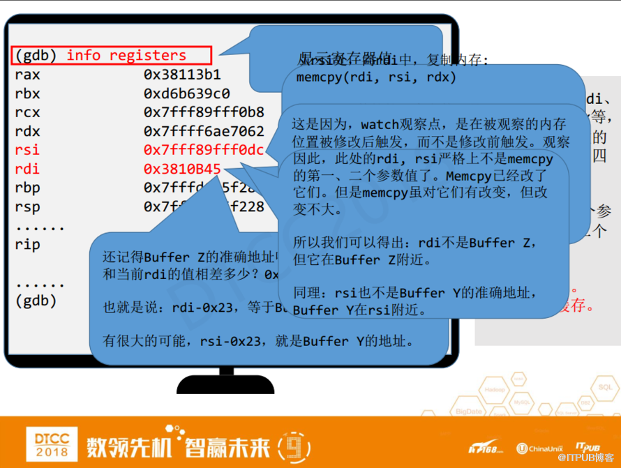 这里我们要使用一个GDB命令叫info registers,显示寄存器。为什么要显示寄存器呢?因为在64位系统中,rdi、rsi、rdx等等都是函数的参数,memcpy函数的第一个参数是目标,第二个参数是源,换句话说就是从第二个参数往第一个参数拷贝,代入到本例中, rdi就是buffer z,rsi就是buffer y。