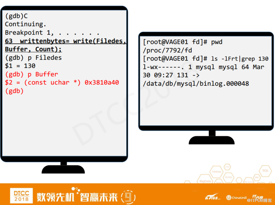 再执行一条commit,我们就能看到输出内容了。方框中是pp函数对应的内容是探针的信息,my_write函数就是MySQL里写binlog到文件所调用的函数,它在my_write.c的第40行。后面的三个参数分别文件号83, 38114B0是前面所说的buffer z,从这个地方binlog数据被写到磁盘里面了,但这还不是精确的buffer z, 17是长度,换算成十进制就是279字节。