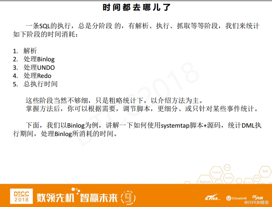 今天,我们主要以介绍方法为主,我主要统计了解析、处理binlog、处理UNDO、处理Redo、总执行时间这五个阶段的时间消耗。下面我们以binlog为例,讲解一下如何使用SystemTap+源码统计电脑执行期间处理binlog的消耗时间,注意这里是统计DML执行时间。